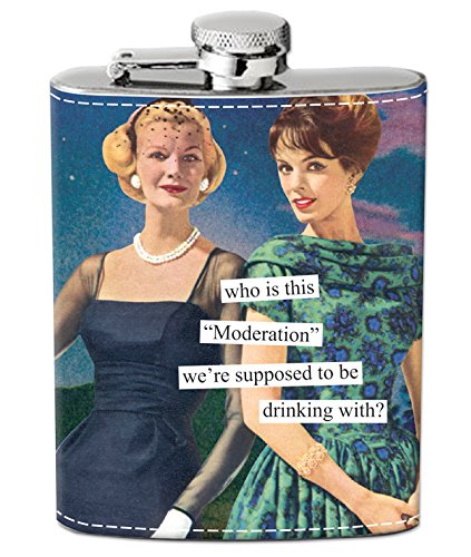 Makes an exceptional gift for weddings, anniversaries, house-warming parties or for any wine lover.Anne Taintor Flask, Moderation is best for youAnne Taintor's dandy little 4-ounce stainless steel flask (featuring wrap-around design) is truly pocket-sized, so a ladylike snort is always at your fingertips! Companion funnel makes refilling a snap. Measures 2.75 by 4.25-Inch including lid. Flask says ' who is this 'Moderation' we're suppose to be drinking with? '.