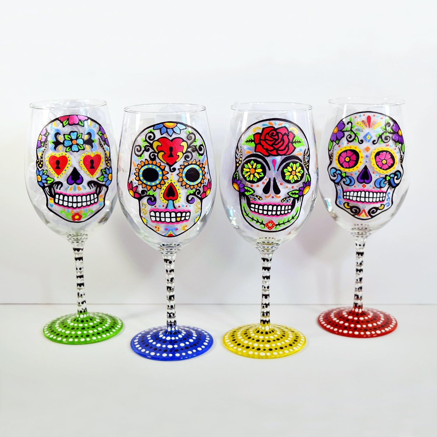 Finally no more judgmental looks from family and friends when you continue to refill your glass. Our Ultimate Wine Bottle Glass holds a full bottle of wine. It truly is a wine glass that fits your needs.- Designed from granite stone, containing properties that keep your drink cooler for longer.- They won't cool as much as ice; they are designed to cool your drink by 8 or 9 degrees F, without diluting those most important complex flavours.- Easy to reuse, simply dry after use, store in the freezer and add rocks to each drink.- Do not place in mouth. Keep out of reach of children.the Sugar Skull Wine Glass, Set of 4 Our uniquely engineered smooth rounded rim and crystal clarity provides a truly luxurious feel.Patented space saving interlocking stackability. Serve and clean up in style.Make broken glass a thing of the past, our shatterproof glass will make your parties last.Coravin Capsules are specifically designed for use with all Coravin Systems, ensuring the perfect seal and the perfect pour every time. Pressurizing bottles with argon gas to pour wine a glass at a time, Coravin Capsules are the power source of the Coravin System, and a fundamental component of the Coravin Technology.Sugar Skull Wine Glass, Set of 4 is best for youColorful Sugar Skulls are hand painted on wine glasses in 4 fun designs. The design is such that the liquid in the glass will color the skull making for a fun variation in the piece depending on your beverage of choice. The stems are meticulously dotted using black and white and each of the bottoms are painted a different color. You will love the unique details of each glass. These make great alter offering pieces for your loved ones on the day of the dead and will liven up any Cinco De Mayo, Halloween or Dia De Los Muertos event. They also add a beautiful touch of color and fun to the dinner table year round. These are hand crafted works and can be displayed as such.The perfect gift for anyone who collects sugar skulls!